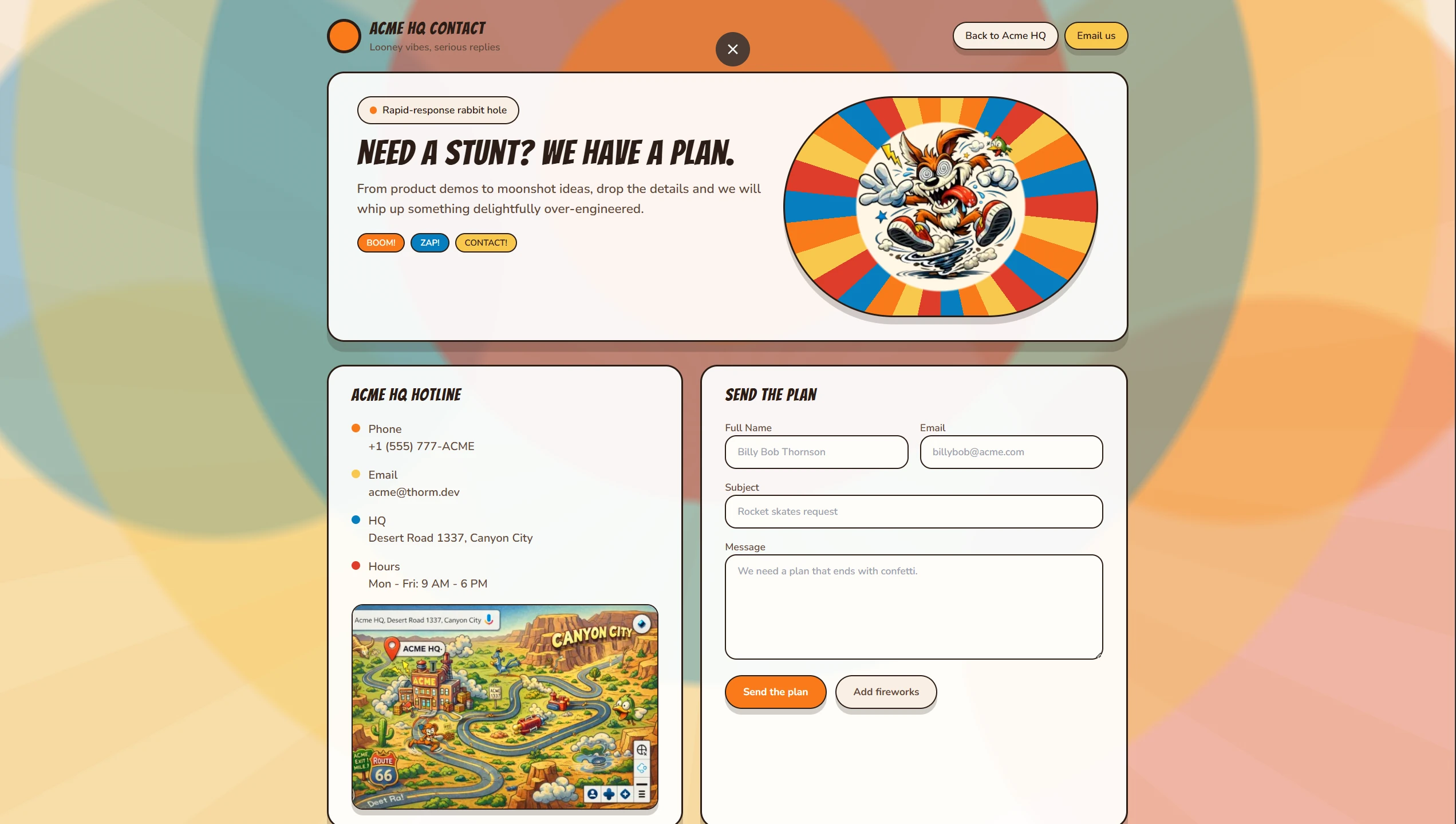 We have received a request from the CTO of ACME HQ, Goof Duckerson, to design and build a dedicated contact page for their organization. Mr. Duckerson supplied detailed specifications, including preferred messaging, layout expectations, and a clear visual direction that reflects ACME HQ’s brand identity. Along with the creative brief, he provided an explicit color scheme and asked that we stay consistent with their established look and feel. He also requested that TailwindCSS be used as the primary styling approach so the implementation remains modern, modular, and easy to maintain. Our goal is to translate these requirements into a clean, accessible contact experience that matches their branding while keeping the codebase efficient and scalable for future updates.